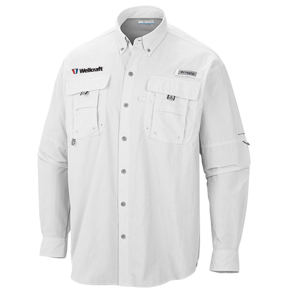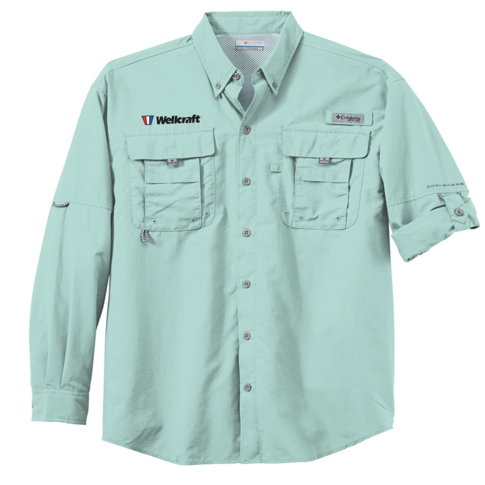 Constructed of ightweight, durable, 100% nylon. Omni-Shade UPF 30 sun protection. Mesh-lined cape vents at back shoulder. Button-down collar. PFG convertible sleeve tabs. Two big chest pockets. Columbia logo on left chest, Wellcraft logo on right chest and PFG logo on vented back.