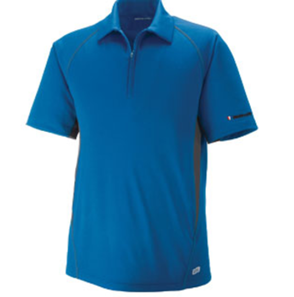 This zippered polo is made of 75% polyester and 25% nylon double knit jacquard and has UTK cool.logik™, moisture wicking and UV protection performance. It features a concealed zippered placket with semi-auto lock rubber pull tab, self fabric collar, contrast color jacquard design with cooling yarns, and contrast color side inserts and cover stitch front and back.